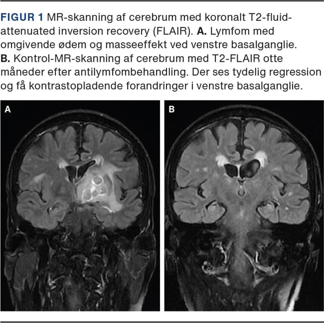 Biokemisk var der upåfaldende infektionstal, let hyponatriæmi 129 mmol/l og normal laktatdehydrogenase. En MR-skanning af cerebrum med kontrast viste patologisk opladende forandringer med nedsat diffusion i relation til venstre basalganglier og corpus callosum, hvilket gav mistanke om lymfom (Figur 1A). En supplerende CT af thorax og abdomen samt helkrops-18F-fluorodeoxyglukose (FDG)-PET var uden tegn på ekstracerebral malignitet. En lumbalpunktur med flowcytometri viste maligne B-celler i cerebrospinalvæsken, hvilket var foreneligt med diffust B-cellelymfom. En knoglemarvsbiopsi var uden tegn til lymfominfiltration. Patienten blev overflyttet til en hæmatologisk afdeling og behandlet med rituximab, højdosis methotrexat med vincristin og intermitterende procabacin. Hun oplevede eklatant effekt af behandlingen, og ved femmånederskontrol var mimik, håndskrift og gangfunktion betydeligt forbedret, men der var fortsat let højresidig bradykinesi ved fingertapping. Ved nimånederskontrol viste MR-skanningen udtalt regression af lymfomet med let kontrastopladende forandringer i venstre basalganglie/mesencephalon (Figur 1B).