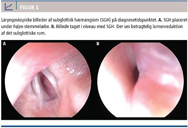 Hun blev genindlagt to gange i de følgende to uger, igen med stridor og krupal hoste, også her afebril. Der blev på ny udført laryngoskopi, hvorved man genfandt højresidig subglottisk hævelse, som nu udfyldte ca. halvdelen af lumen (Figur 1). De endoskopiske fund sammenholdt med sygehistorien vurderedes at være klinisk forenelige med diagnosen SGH. Man påbegyndte propanololbehandling med eklatant effekt efter 24-48 timer, hvorefter stridoren var væk. Patienten blev udskrevet efter tredje døgn og fulgt ambulant uden symptomer eller bivirkninger af behandlingen. Ved ambulant kontrol efter tre måneder sås der betydelig reduktion og afblegning af SGH.