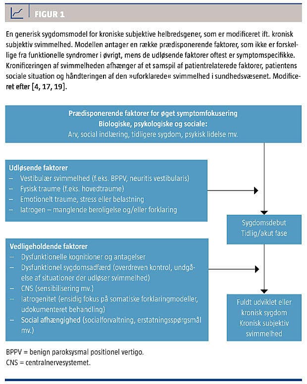 Forekomst og forløb af subjektiv svimmelhed udviser de samme karakteristika, som kendes fra andre uspecifikke, idiopatiske eller »uforklarede« fysiske symptomer [4, 5, 11, 12], og en sygdomsmodel af subjektiv svimmelhed må derfor tage udgangspunkt i en generisk forståelse af subjektive helbredsgener snarere end i en snæver symptomspecifik forståelse [16-20] (Figur 1). Dette betyder dog ikke, at symptomspecifikke tilgange ikke kan bidrage til at forklare vedvarende svimmelhedsgener. Dette gælder især for den såkaldte sekundære somatoforme svimmelhed [5], hvor det at have været udsat for yderst ubehagelig svimmelhed i forbindelse med neuritis vestibularis, vestibulær migræne eller gentagne episoder af BPPV indgår i forståelsen af vedvarende svimmelhedssymptomer igennem øget symptomfokusering og mulig sensibilisering af centralnervesystemet [4, 5, 11, 13]. En forholdsvis stor del af patienterne med kronisk subjektiv svimmelhed har således en eller flere episoder med vertigo i anamnesen; disse anses i dag som udløsende for de vedvarende symptomer, mens der ikke er belæg for vedvarende vestibulær dysfunktion hos patienter med kronisk subjektiv svimmelhed [4, 13]. I et prospektivt studie med psykisk raske personer, der var indlagt med nyopstået neuritis vestibularis, prædikterede patienters frygt for nye svimmelhedsanfald således allerede på dag ti kronisk svimmelhed to år senere [12].