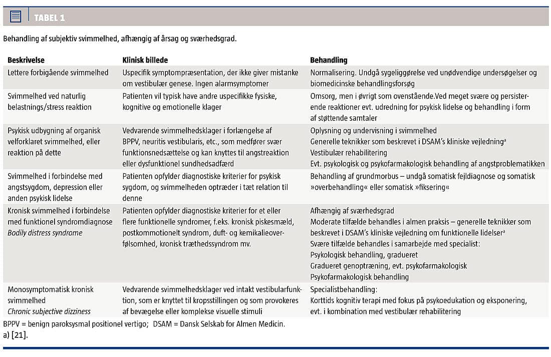 Behandlingen af subjektiv svimmelhed kan inddeles efter behandlingsmetode (fysioterapeutisk, psykologisk, psykofarmakologisk), men vil i praksis afhænge af sværhedsgrad og kontekst [20] (Tabel 1).