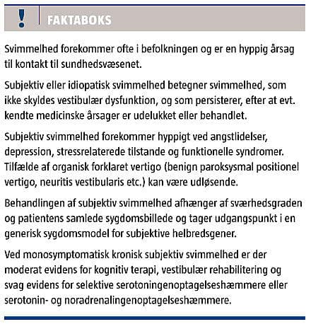symptom behandles efter gældende retningslinjer. Ved monosymptomatisk kronisk subjektiv svimmelhed bruges selektive serotoningenoptagelseshæmmere hyppigt i specialiserede settings [4], men der mangler større velgennemførte kliniske randomiserede undersøgelser til vurdering af effekten af selektive serotoningenoptagelseshæmmere eller serotonin- og noradrenalingenoptagelseshæmmere [29, 30]. Ift. medicinsk behandling af vertigo henvises til relevante artikler i dette temanummer.