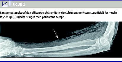 En 78-årig mand, der tidligere havde fået konstateret metastaserende renalcellekarcinom, og som var i behandling med prednisolontabletter, 50 mg daglig, var tre uger forinden faldet og havde pådraget sig sår over venstre olecranon. Armen blev tiltagende hævet. Egen læge fandt subkutan krepitation og henviste patienten til akut vurdering.