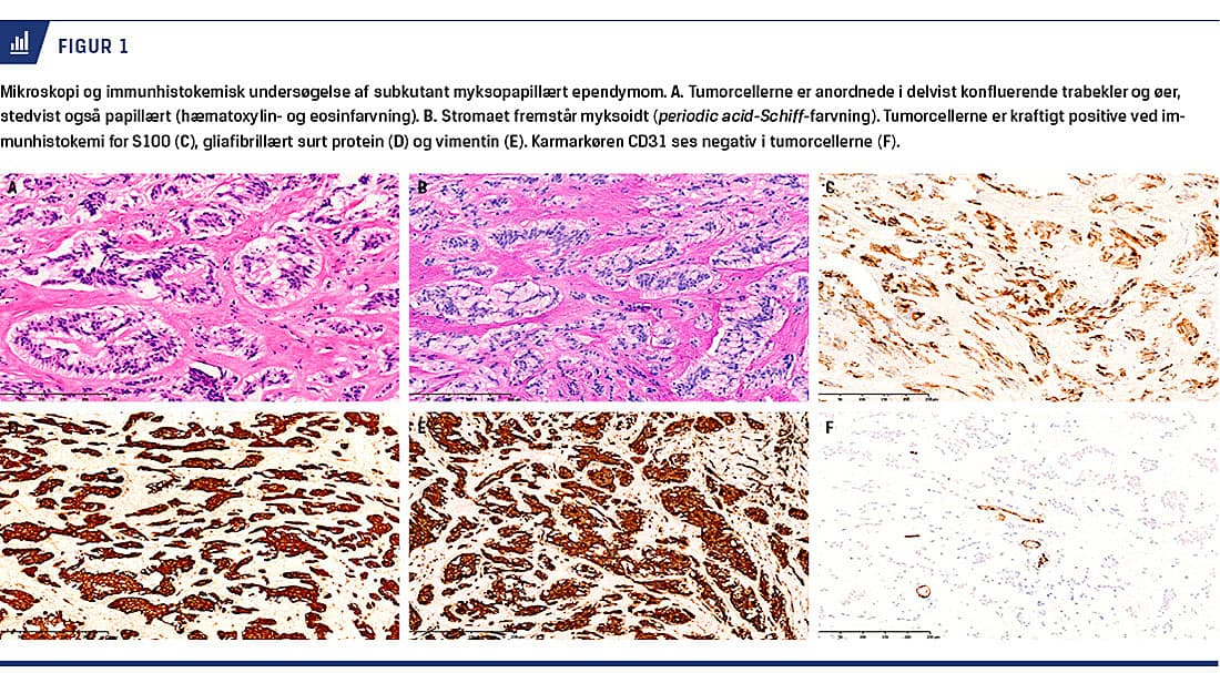 Mikroskopisk sås det, at tumoren var opbygget af kubiske celler, der var ordnede i delvist konfluerende trabekler og øer (Figur 1A), som var adskilt af et myksoidt bindevæv (Figur 1B). Tumorcellerne havde ensartede kerner, og der blev ikke talt nogen mitoser på ti synsfelter. Ved immunhistokemi fandt man kraftig positivitet for S100 (Figur 1C), gliafibrillært surt protein (Figur 1D), vimentin (Figur 1E) og CD56, men negativitet for bredspektrede cytokeratiner, CD31 (Figur 1F), CD34, CD45, CD163, chromogranin A, epiteliel membranantigen, HMB45, isocitratdehydrogenase 1, melan A, oligodendrocyttranskriptionsfaktor 2, synaptofysin og karcinoembryonalt antigen. Det myksoide stroma var svagt periodic acid-Schiff-positivt. Proliferationsmarkøren Ki67 var udtrykt i under 1%. På grundlag af disse fund blev diagnosen SME stillet.