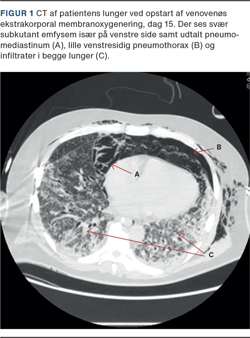 En 49-årig mand, ellers sund og rask, var involveret i et højenergitraume og pådrog sig bl.a. en traumatisk næramputation af højre overekstremitet (OE) med store bløddelslæsioner og fraktur af humerusskaftet. Han gennemgik gentagne operationer af højre OE med debridement, ekstern fiksation, vacuum-assisted closure (VAC)-behandling og intern fiksation. Han blev herefter henvist til højt specialiseret afdeling grundet bløddelsnedbrud over frakturstedet. Her blev der foretaget fjernelse af marvsøm, forkortning af humerus og skinneosteosyntese samt direkte lukning af bløddelsdefekten. Grundet frakturrelateret infektion med Staphylococcus epidermidis i vævsprøver opstartedes behandling med peroral clindamycin 600 mg × 3. Postoperativt opstod der fornyet bløddelsnedbrud. Der blev foretaget sårrevision og opstartet VAC-behandling. Vævsprøver var positive i 5/5 Kammesæt for Escherichia coli og Stenotrophomonas maltophilia. Der blev opstartet peroral ciprofloxacin 500 mg × 2 og sulfamethoxazol med trimethoprim 1600/320 mg × 4 – herfra defineret som dag 0. Dag ni blev der, på mistanke om pneumoni, startet behandling med amoxicillin med clavulansyre 500/125 mg × 3. Dag 11 blev han indlagt på lokalsygehus grundet stigende infektionstal, feber og lav iltsaturation. Dag 14 blev han intuberet grundet et pågående højt iltkrav (FiO2 100%), og dag 15 overflyttet til behandling med VV-ECMO (CT fra dag 15 kan ses i Figur 1). Til trods for intens fokusjagt inkl. gentagne dyrkninger af blod og trakealsekret (også fra bronkoalveolær lavage) blev en infektiøs årsag til hans respirationsinsufficiens aldrig påvist. Lungeemboli blev udelukket af flere omgange. På mistanke om sulfamethoxazol med trimethoprim-induceret pneumonitis blev dette seponeret efter i alt 17 dages behandling, og CRP faldt.