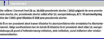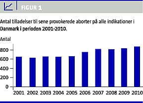 Antallet af sene provokerede aborter, der udføres i Danmark, stiger (Figur 1 ) hovedsageligt på grund af udbredelsen af de fosterdiagnostiske tilbud, der trådte i kraft med Sundhedsstyrelsens nye retningslinjer i 2004 [3]. Som følge heraf opdages der flere føtale misdannelser, og flere gravide kvinder vælger at søge om tilladelse til en sen provokeret abort. Størstedelen af tilladelserne til sene provokerede aborter gives således på baggrund af misdannelser hos fostret. I 2010 udgjorde denne indikation 59,6% af alle tilladelser [4], hvilket var en væsentlig højere andel end tidligere. Til sammenligning blev 42,7% af tilladelserne i 2001 givet på baggrund af føtale misdannelser [5].