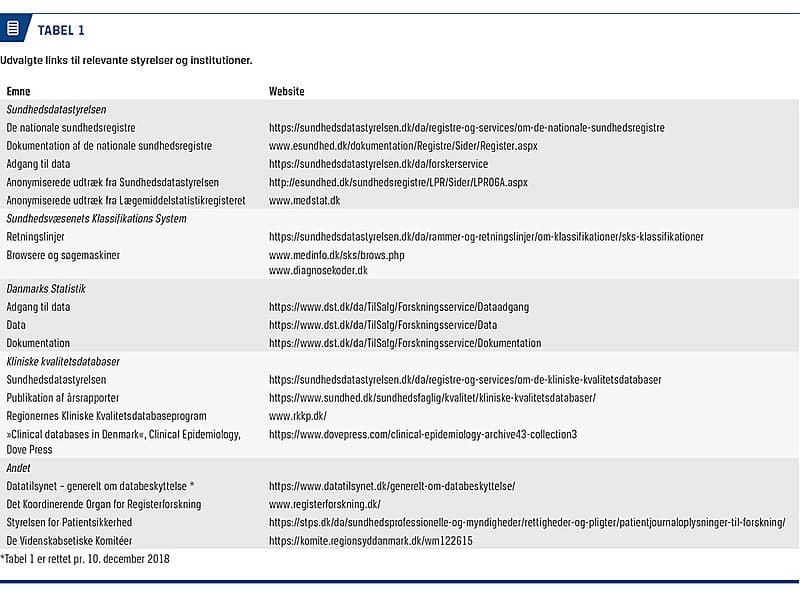 I Danmark er der en stolt tradition for udarbejdelse af registerforskning, hvilket er forskning på data, der er indsamlet i forbindelse med ikkeforskningsrelaterede begivenheder som f.eks. indlæggelser, receptudleveringer eller dødsfald. Dansk registerforskning er bl.a. muliggjort af vores unikke CPR-nummersystem, etablering af sygdomsregistre, landsdækkende og nærkomplette indsamlinger af administrative data og kliniske databaser igennem mange år samt muligheden for at tage højde for immi- og emigration, død og andre former for censurering [1-6]. De danske registre er beskrevet i adskillige publikationer [3-12]. Mange er validerede på nøglevariable og population, og de anses generelt som værende troværdige, til trods for at der stadig er problemer med misklassifikation og ukomplette data i