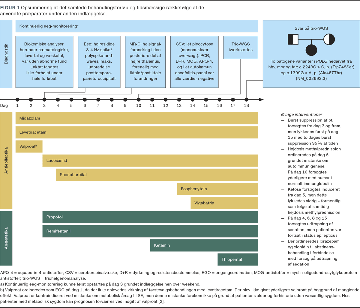 50 dage senere blev pigen genindlagt med fokal SE med vedvarende trækninger i venstre overekstremitet, synstab og forværring af nystagmus. En udredning for autoimmun encefalitis viste intet unormalt, og MR-C viste postiktale forandringer i højre thalamus. Trods behandling med højdosis levetiracetam og kontinuerlig midazolaminfusion udviklede tilstanden sig til SRSE. Det samlede behandlingsforløb er opsummeret i Figur 1.