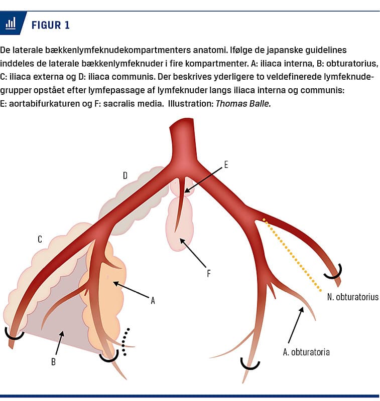 Hvad der er den optimale behandling af suspekte LBLK, er omdiskuteret og som udgangspunkt forskellig i Vesten og Japan samt andre østasiatiske lande. Traditionelt er behandlingen i Danmark og den øvrige vestlige verden overvejende ikkekirurgisk, idet malignitetssuspekte LBLK generelt anses som tegn på udbredt sygdom (M+). Ifølge de danske retningslinjer (Danish Colorectal Cancer Group) defineres alle lymfeknuder i mesorectum, præsakralt, langs a. rectalis superior, a. mesenterica inferior og a. iliaca interna som regionale lymfeknuder [7], men LBLK er ikke defineret nærmere. I Japan er LBLK klart defineret i anatomiske kompartmenter (Figur 1) og anses i langt højere grad som regional sygdom (N+), der kan behandles kirurgisk og i de fleste tilfælde uden nSKT.