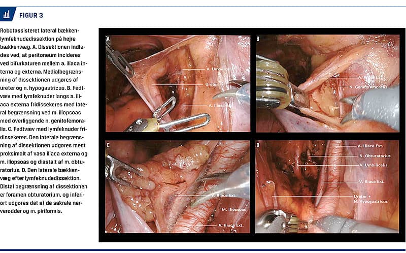 Den vestlige behandlingsstrategi bygger på en forventning om, at nSKT eliminerer eventuelle maligne lymfeknuder på bækkenvæggen og de fjernes derfor ikke ved den efterfølgende operation (Figur 2). I Japan har lateral bækkenlymfeknudedissektion (LBLKD) derimod været anvendt siden 1970‘erne [8] og anbefales rutinemæssigt ved TME af cT3-4-tumor lokaliseret 0-10 cm fra analåbningen og i alle tilfælde med klinisk mistanke om maligne LBLK [9]. I Figur 3 vises de forskellige trin og landmarks i udførelsen af robotassisteret LBLKD.