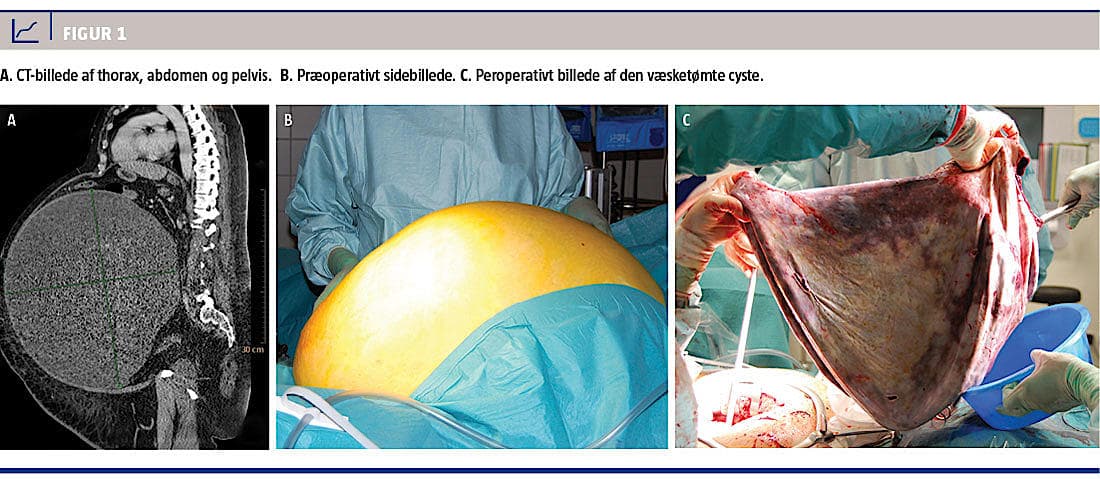 På gynækologisk afdeling så man dernæst ved transabdominal ultralydskanning en stor, glatvægget, cystisk proces med flere kamre uden ekskrescenser. CA-125-niveauet var 241 kE/l. Risk of Malignancy Index var 241. På grund af den lange anamnese vurderedes cysten at være benign, men patienten blev opereret af speciallæger med subspeciale i henholdsvis benign gynækologi og gynækologisk onkologi. Operationen indledtes med laparoskopi, hvor man udtømte 20 l væske fra cystens store kammer. På grund af blødning fra cystens fødekar og dens størrelse konverteredes til laparotomi med nedre længdesnit. Der blev foretaget højresidig salpingo-ooforektomi med fjernelse af et mukøst cystadenom på i alt ca. 40 kg, der bestod af 37 l cystevæske og 3 kg cystevæv (Figur 1B). Det præoperative abdominalomfang var 165 cm (Figur 1C). Det postoperative forløb var kompliceret af abdomen pendens-problemer.