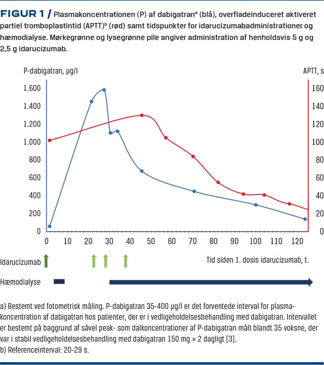 Den første måling af P-dabigatranniveau blev foretaget 45 minutter efter administration af idarucizumab og viste et lavt niveau (49 µl/g) (Figur 1). Indenfor det næste døgn steg P-dabigatranniveauetmarkant (1.586 µl/g) på trods af intermitterende dialyse og behandling med frisk frosset plasma. I løbet af det andet indlæggelsesdøgn blev der givet idarucizumab 2,5 g a tre omgange pga. vedvarende svært forhøjet P-dabigatranniveau. Da der fortsat var utilstrækkelig reversering, blev der påbegyndt kontinuerlig hæmodialyse. Dabigatraneliminationen gik særdeles langsomt; først fire døgn efter indlæggelsen var P-dabigatranniveauet faldet, så det var foreneligt med vedligeholdelsesbehandling [3]. Normalisering af aktiveret partiel tromboplastintid (Figur 1) og P-kreatininniveau(100 µmol/l på dag 5) skete ligeledes langsomt.