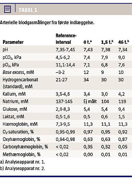 Der blev taget blodprøver, som viste følgende værdier med referencenivauer i parentes: P-natrium 109 mM (137-145 mM) og B-hæmoglobin 13,3 mM (7,3-9,5 mM). En arteriel blodgasmåling viste kompenseret respiratorisk acidose og let hypoxæmi. Der var en svært forhøjet COHb- koncentration på 35% (referenceniveau < 2%). Laktat- og methæmoglobinniveauerne var normale (Tabel 1).