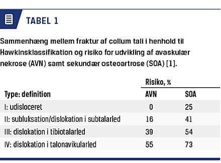 Tabel 1 viser sammenhængen mellem frakturtype og risikoen for udvikling af avaskulær nekrose og sekundær osteoartrose. Tabellen er baseret på poolede data fra mindre, retrospektive serier og er derfor forbundet med en vis usikkerhed [2].