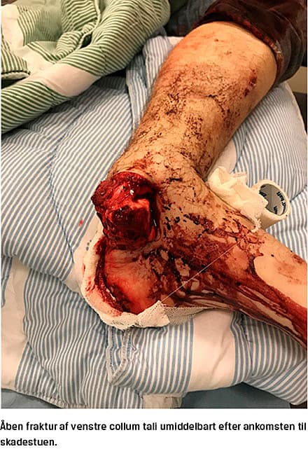 For at kunne reponere måtte incisionen udvides, og bløddele holdes til side. Frakturen reponeredes under træk i underbenets længdeakse med direkte tryk på den distale fragme og indadrotation af foden. Repositionen kontrolleredes i gennemlysning. Herefter blev frakturen stabiliseret med ekstern fiksering, og huden kunne sutureres. Postoperativt var der normale pulsforhold.