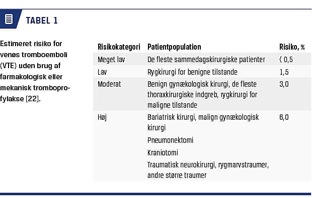 I The American College of Chest Physicians 9. udgave af retningslinjen om tromboseprofylakse hos ikkeortopædkirurgiske patienter fokuseres der på patientrelaterede og procedurerelaterede risikofaktorer [22]. Tromboserisikoen ved sammedagskirurgiske indgreb, herunder laparoskopi af maks. to timers varighed, er kategoriseret i gruppen »meget lav« (Tabel 1). Hos raske patienter, som er under 60 år og har et body mass index (BMI) < 30 kg/m2, anbefales ingen eller kun mekanisk profylakse [22].