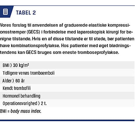 Der findes ingen overordnede nationale danske retningslinjer for tromboseprofylakse ved kirurgi, men mange selskaber, som f.eks. Danish Colorectal Cancer Group, har retningslinjer for udvalgte patientkategorier, og de fleste danske kirurgiske afdelinger har lokale retningslinjer om anvendelsen af en kombinationsprofylakse med lavmolykulær heparin og knælange GECS, hvilket generelt følges. Det kan derfor være svært, selv ved manglende evidens, at anbefale afskaffelsen af GECS i forbindelse med benign laparoskopisk kirurgi. Indtil der foreligger randomiserede data eller større databasestudier om både effekten og bivirkningsprofilen af GECS og andre mekaniske antitrombosemidler er det vanskeligt at lave anbefalinger vedrørende GECS. Vi foreslår, at anvendelsen af GECS skal være baseret på en risikovurdering af den enkelte patient (Tabel 2).