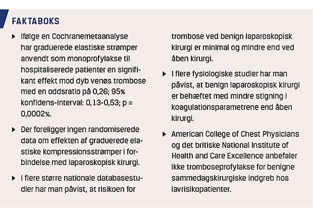 I større udenlandske retningslinjer på området har man dog vurderet risikoen for, at patienterne får VTE ved sammedagskirurgiske benigne laparoskopier, til at være meget lille og har ikke fundet indikation for tromboseprofylakse hos raske sammedagskirurgiske patienter, ej heller de laparoskopiske.