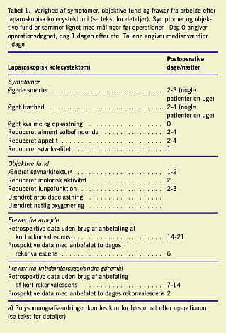 Under hensyntagen til individuelle forskelle er de fleste subjektive symptomer og objektive fysiologiske ændringer normaliseret inden for ganske få dage efter laparoskopisk kolecystektomi (Tabel 1 ).