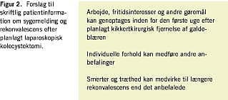 Nyere prospektive danske data har sandsynliggjort, at rekonvalescensperioden på flere uger efter laparoskopisk kolecystektomi kan afkortes med 50-60% ved standardiseret brug af rekonvalescensanbefaling på to dage [4]. I denne undersøgelse af 200 konsekutive danske patienter var valget af anbefaling af to dages rekonvalescens vilkårligt. Man valgte at undersøge de begrænsende faktorer for en meget kort rekonvalescens [4]. I dette regimen var fraværet fra arbejdet på seks dage (median) og fra fritidsaktiviteter på to dage [4]. Det kunne påvises, at patienternes egne forventninger og planlægning før operationen samt smerter og træthed efter operationen var de vigtigste årsager til rekonvalescens ud over de første 2-3 dage efter laparoskopisk kolecystektomi [4]. Sufficient smertebehandling og præoperativ engangsbehandling med steroid [9, 10] er vist at kunne afkorte rekonvalescenslængden signifikant efter laparoskopisk kolecystektomi.
