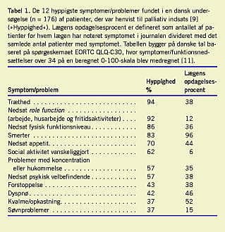 I Tabel 1 vises udvalgte resultater fra en undersøgelse af patienter, der var henvist til palliativ indsats på Palliativ Medicinsk Afdeling, Bispebjerg Hospital. Ud af 278 konsekutive patienter var 267 dansktalende og mindst 18 år. Af disse udfyldte 176 (66%) spørgeskemaet helt eller delvis. Dette viste således, at rutinemæssig anvendelse af spørgeskemaer er gennemførlig. I tabellen vises de 12 hyppigste symptomer og problemer, der blev målt med spørgeskemaet EORTC QLQ-C30. Til sammenligning kan nævnes en nylig publiceret amerikansk undersøgelse [8]. Det amerikanske studium omfattede i alt 48 symptomer, men man vurderede ikke funktionstab. Den relative hyppigh ed i de to studier var nogenlunde den samme. De hyppigste symptomer, der ikke indgik i den danske undersøgelse, var mundtørhed (67%), vægttab (54%), tidlig mæthedsfølelse (49%) og hoste (39%).