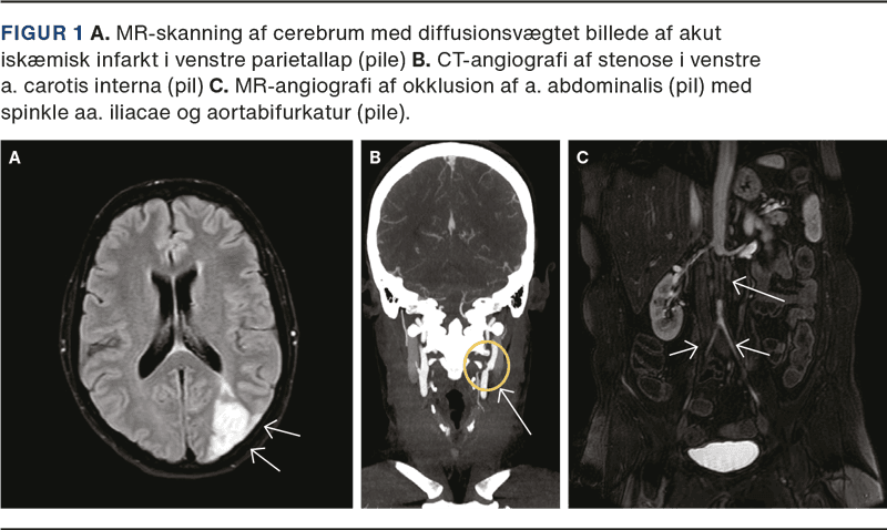 En 44-årig kvinde med Sjögrens syndrom og mangeårig fibromyalgi blev indlagt grundet hovedpine varende tre uger og ordmobiliseringsbesvær varende en uge, ændret finmotorik i højre hånd samt fokuserings- og forståelsesvanskeligheder ved skrivning og læsning. En neurologisk undersøgelse viste herudover højresidig øvre homonym kvadrantanopsi og visuel inattention mod højre. MR-skanning af cerebrum viste subakutte infarkter i venstre vandskelsområder, og CT-angiografi af hjerne og halskar viste svære stenoser proksimalt i venstre a. carotis interna, a. carotis externa og a. subclavia (Figur 1 A + B).