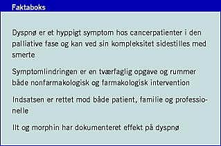 Dyspnø er et almindeligt symptom blandt terminale cancerpatienter - afhængig af cancertype og komorbiditet. Blandt patienter med lungecancer er der rapporteret en prævalens på 84%, og generelt blandt terminale cancerpatienter er der rapporteret en prævalens på omkring 50% [2]. Denne artikel omhandler symptomlindring af dyspnø i den sidste fase af livet.