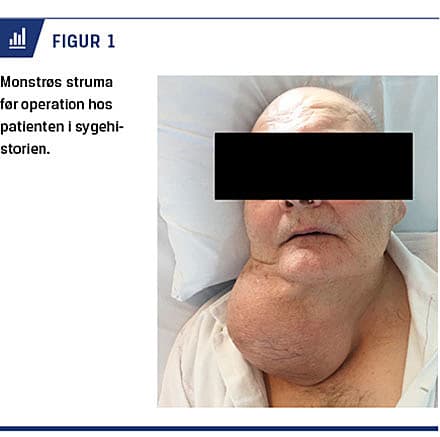 En 70-årig eutyroid mand med en stor hævelse på halsen (Figur 1) blev henvist til en øre-, næse- og halskirurgisk afdeling. Han oplyste, at han sad op og sov, da han blev utilpas i liggende stilling, og besvimede, hvis han drejede hovedet hurtigt mod højre. Derudover var stemmen blevet svagere. Han havde op til denne indlæggelse været indlagt gentagne gange på en kardiologisk afdeling pga. recidiverende synkoper, men en kardial årsag til disse kunne ikke påvises. En CT forud for indlæggelsen havde vist en højre thyroidealap på 15 × 12 × 13 cm med både trakeal deviation og kompression samt kompression af højre arteria carotis communis og sinus caroticus.