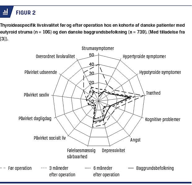 Store strumaer behandles oftest kirurgisk med enten en hemityroidektomi eller total tyroidektomi. Herved opnås tilstrækkelig dekompression af de omkringliggende strukturer, væv kan sendes til histologisk undersøgelse for ukendt malignitet, og risikoen for efterfølgende recidiv undgås. Ved symptomgivende struma er tyroidektomi en effektiv behandlingsform med stor symptomlindrende effekt, og efter operationen opnås en livskvalitet nær baggrundsbefolkningens (Figur 2) [3]. Den kasuistisk beskrevne risiko for postoperativ trakeomalaci er uhyre sjælden [4], hvor-imod der er en ikke ubetydelig risiko for hypokalcæmi og recurrenspåvirkning efter en operation [5].