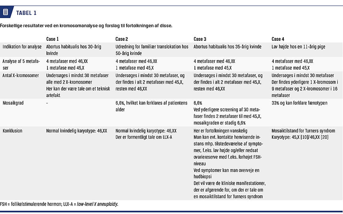 at tab af det ene X-kromosom hos kvinder er et normalt aldersbetinget fænomen [1]. Der er ikke enighed om, hvornår der præcis kan være tale om LLX-A, selvom man i nogle studier har prøvet at adressere det [2]. Således skal man snarere betragte tilstedeværelsen af celler med X-kromosomaneuploidi som et spektrum, der strækker sig fra de fænotypisk normale kvinder til kvinder, der har et eller flere symptomer på de kendte X-kromosomaneuploiditilstande. Derfor er det svært at komme med præcise retningslinjer, og alle med X-kromosomaneuploiditilstande skal vurderes individuelt og evt. i samarbejde med den henvisende kliniker (Tabel 1).