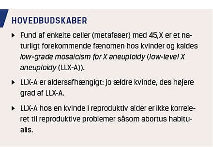 During chromosome analysis the finding of few cells with X-chromosome aneuploidy in a phenotypically normal woman is not unusual – so-called low-grade mosaicism for X aneuploidy (LLX-A). Such results can be difficult to interpret. In this review, LLX-A and its clinical implications are discussed, and based on the current literature it can be concluded, that LLX-A is an age-related phenomenon not related to reproductive issues such as recurrent abortions. This should be taken into account in any laboratory performing chromosome analysis.