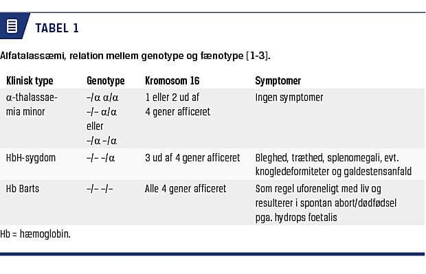 En defekt i et eller flere af de fire alleler, som koder for alfaglobin, resulterer i alfatalassæmi. Afhængigt af hvor mange af de fire gener som er ramt, varierer sværhedsgraden fra ingen symptomer til en tilstand, som er uforenelig med liv (Tabel 1) [1-3].