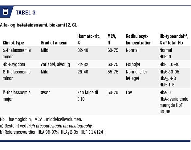Der anbefales screening ved første svangreundersøgelse hos den praktiserende læge af alle gravide, som stammer fra områder med høj prævalens. Screening udføres i to trin: Indledningsvis måles niveauerne af hæmoglobin, hæmatokrit, middelcellevolumen (MCV), retikulocytter og ferritin. Hvis disse prøver giver mistanke om talassæmi, bør der udføres hæmoglobintypebestemmelse på et speciallaboratorium (se Tabel 3 for fortolkningen) [2, 7-9]. Et MCV-niveau over 78 fl udelukker med stor sandsynlighed talassæmi.