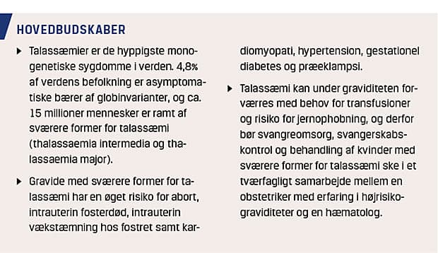 Talassæmi er en sjælden sygdom. Hos kvinder kan talassæmi give alvorlige komplikationer under graviditet og fødsel. Det er en tilstand, som behandles på højtspecialiserede afdelinger, dog kan alle møde disse patienter, og især viden om håndtering af gravide patienter med talassæmi er vigtigt.