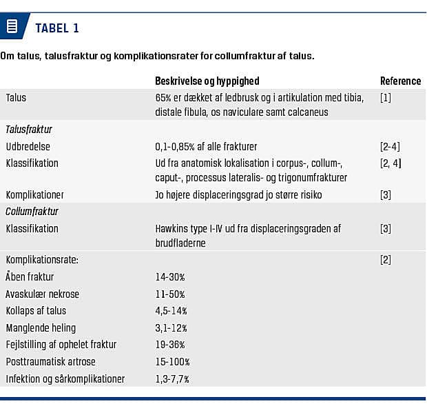 Talus, rullebenet, er en kompakt fodknogle, som bærer hele kroppens vægt. Langt de fleste brud er intraartikulære [1] og forbundet med stor risiko for forskellige komplikationer såsom posttraumatisk artrose og avaskulær nekrose (Tabel 1). Der findes af den grund signifikant patientmorbiditet ved skade på denne knogle [1-4]. Den typiske patient med en talusfraktur vil efter et højenergitraume have smerter og hævelse omkring ankelledet. Hævelse og evt. fejlstilling kan maskere anatomiske landemærker [4]. Der kan være åben fraktur eller truet hud. Ved en røntgenoptagelse af fodleddet kan diagnosen bekræftes, og der kan suppleres med CT, hvis der fortsat er tvivl om tilstanden eller behov for yderligere klassifikation [2, 4] (Tabel 1). Pga. den begrænsede blodforsyning til talus er hurtig reponering essentiel, hvilket især gælder ved displacering af brudflader, åben fraktur eller neurovaskulær skade [1-4]. Man anbefaler at forsøge akut lukket reponering, når man har erkendt en disloceret talusfraktur billeddiagnostisk, men det skal efterfølgende stort set altid følges af en definitiv operativ behandling [2, 3].