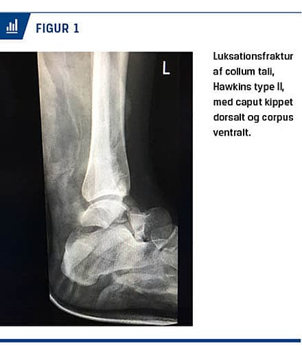 efter at hun under bygningsarbejde på et tag var faldet 3,5 m ned på jorden. Ved modtagelse på skadestuen havde hun mange smerter fra venstre fodled, som klinisk blev fundet fejlstillet med foden let inverteret og et diskret frempromenerende element anteriort. Hun var stærkt øm over malleolerne og området herimellem. Tilstanden blev af forvagten på skadestuen tolket som en disloceret bimalleolær fraktur, hvorfor der som standardpraksis blev foretaget forsøg på grovreponering og derefter gipsning af anklen. En efterfølgende røntgenoptagelse viste en luksationsfraktur af collum tali, Hawkins type II, med caput kippet dorsalt og en diastase på 12 mm centralt i frakturspalten (Figur 1). Corpus var kippet ventralt og displaceret posteriort. På en CT kunne røntgenfundet bekræftes og yderligere ossøs skade udelukkes.