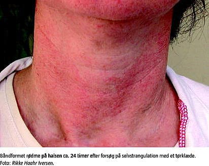 Hvis man ser bort fra de to, som forsøgte regelret hængning, havde de patienter, som havde været -udsat for moderate forsøg på selvstrangulation, få symptomer, og langt de fleste selvstrangulationer var registreret i obs-gruppen (n = 51, 94%). Signifikant færre havde dysfagi og dysfoni (henholdsvis