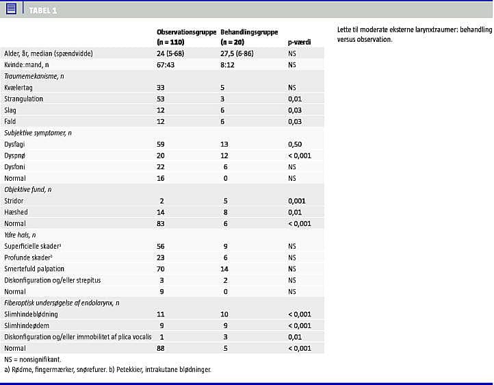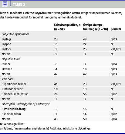 Resultater: Hos 43% var strangulation den primære henvisningsårsag, efterfulgt af kvælertag (29%), fald (14%) og slag (14%). Dysfagi var det hyppigste subjektive fund (55%), 17% var hæse og 5% havde stridor. Ved direkte fiberlaryngoskopi havde 33% endolaryngeal patologi (ødem og/eller sugillation). Tyve (15%) modtog behandling, heraf var 20% børn, 110 (85%) blev observeret. Akut intubation blev foretaget hos 2,3%. Moderate forsøg på selvstrangulation udgjorde den største andel af observationsgruppen (p = 0,01), fald og slag var hyppigere i behandlingsgruppen (p = 0,03). Dyspnø (< 0,001), hæshed (p = 0,007), stridor (p = 0,001) og endolaryngeal patologi (p < 0,001) var hyppigst i behandlingsgruppen.