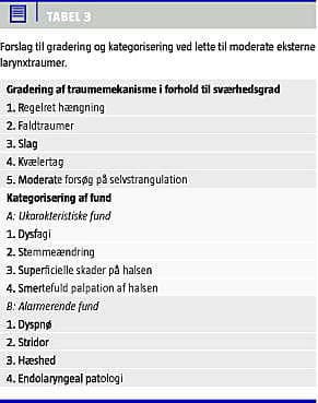 Ud fra ovenstående foreslår vi følgende gradering af traumemekanismerne i forhold til sværhedsgrad (Tabel 3 ): 1) regelret hængning, 2) faldtraumer, 3) slag, 4) kvælertag og 5) moderate forsøg på selvstrangulation. Hvad angår symptomer foreslås følgende kategorisering: A) ukarakteristiske fund: dysfagi, subjektiv fornemmelse af stemmeændring, superficielle skader på halsen og smertefuld palpation af halsen, B) alarmerende fund: dyspnø, stridor, hæshed og endolaryngeal patologi.