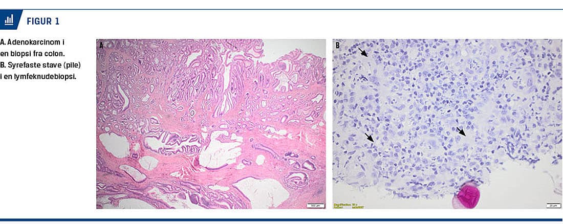 Han blev herefter overflyttet til en gastrokirurgisk afdeling, hvor der ved en eksplorativ laparotomi blev foretaget aflastende stomi og taget biopsi fra stenosen omkring coecum. Tumoren blev ikke fjernet, da der fortsat var mistanke om dissemineret sygdom pga. malignsuspekte lymfeknuder i mesenteriet og de multiple tyndtarmsstenoser. Histologisk fandtes der ikke tegn på spredning af adenokarcinomet, men syrefaste stave i lymfeknuden (Figur 1B).