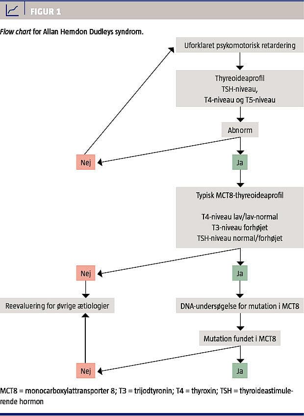 niveau; en thyroideaprofil, der er typisk for MCT8, bør føre til DNA-undersøgelse for AHDS (Figur 1). En maternel anamnese med abnorm thyroideafunktion bør også noteres. Der findes i skrivende stund ikke nogen kendt behandling for AHDS, og de neurologiske skader er irreversible, men tidlig diagnosticering er essentiel for den genetiske udredning i den pågældende familie og tilbud om prænatal diagnostik i fremtidige graviditeter.