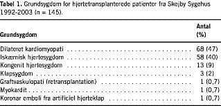 I perioden fra den 31. december 1992 til den 1. februar 2003 blev der på Skejby Sygehus udført 146 hjertetransplantationer på 145 patienter (117 mænd og 28 kvinder). Gennemsnitsalderen var 44,7 år (spændvidde: 2,4-65,7 år). Tretten børn med en gennemsnitsalder på 11,8 år (spændvidde 2,4-16,6 år) blev hjertetransplanteret. Grundsygdommene fremgår af Tabel 1 . I hele perioden blev i alt 178 patienter indstillet til hjertetransplantation. Heraf døde 18 patienter (10%), ni patienter kunne senere afmeldes pga. bedring, og seks patienter står fortsat på listen (februar 2003). Den gennemsnitlige ventetid på hjertetransplantation var 80 dage (spændvidde 0-347 dage). Seksogtredive patienter (25%) var indlagt op til transplantationstidspunktet. Af disse var ni patienter blevet behandlet med støtte af en mekanisk pumpe (assist device ) (8 Biomedicus, 1 Thoratec), mens 27 behøvede kontinuerlig intravenøs behandling med inotropika.