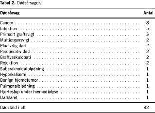 Af vore gennem ti år hjertetransplanterede patienter er 113 af 145 stadig i live (78%). Kun to patienter døde peroperativt. Yderligere syv patienter døde inden for de første 30 dage (tre af graftsvigt, to af multiorgansvigt, en af pulmonalblø dning og en af hjertestop under hæmodialyse). Den samlede 30-dages-mortalitet var således på 6%. Senere i forløbet døde yderligere 23 patienter. Dødsårsagerne fremgår af Tabel 2 .