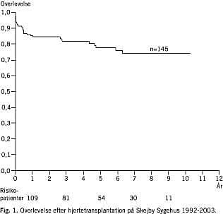 Resultater: I perioden fra den 31. december 1992 til den 1. februar 2003 blev der foretaget 146 hjertetransplantationer på 145 patienter på Skejby Sygehus. Den samlede etårsoverlevelse var på 85%, og femårsoverlevelsen var på 78% (Kaplan-Meier). Af de 146 donorer var 32 (22%) ældre ( ≥ 50 år) såkaldte marginaldonorer. Overlevelsen i gruppen af transplanterede, hvor en ældre donor var anvendt, var ikke signifikant forskellig fra overlevelsen hos de øvrige patienter (log rank test p = 0,40). Den samlede mortalitet på ventelisten til hjertetransplantation var kun på 10% (18 ud af 178 patienter). Den gennemsnitlige ventetid var på 80 dage (spændvidde 0-347 dage).