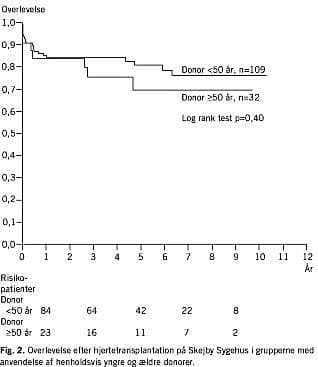 Etårsoverlevelsen og femårsoverlevelsen (Kaplan-Meier) var på henholdsvis 85% og 78% for det samlede materiale (Fig. 1 ). Af de 32 patienter, som modtog hjertet fra en donor ≥ 50 år, er otte (25%) døde, heraf tre (9%) inden for de første 30 dage. Kun et af disse tre tidlige dødsfald i gruppen med anvendelse af marginaldonorer indtraf pga. primært graftsvigt. Kun tre (15%) af de 27 patienter, hvor donorhjertet kom fra udlandet, er døde, og kun en er død af primær graftsvigt/blødning. Etårsoverlevelsen og femårsoverlevelsen i gruppen af transplanterede, hvor hjerter fra ældre donorer blev anvendt, var på henholdsvis 84% og 70% og ikke signifikant forskellig (log rank test p=0,40) fra overlevelsen i restgruppen (85% og 81%) (Fig. 2 ).