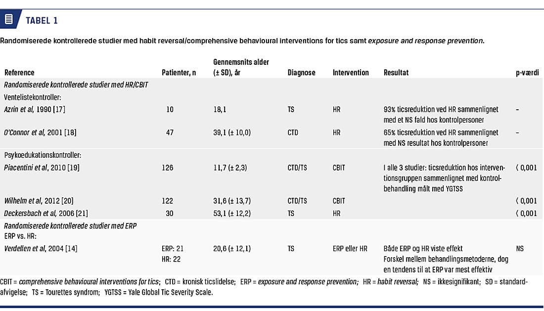 I denne artikel er inkluderet RCT’er, hvor man har undersøgt effekten af HR [17-21]. Resultaterne af disse ses i Tabel 1. I studierne har man primært undersøgt effekten på ticsfrekvens og -sværhedsgrad målt med Yale Global Tic Severity Scale (YGTSS). I en metaanalyse fra 2014 fandt man, at ticsundertrykkende behandling havde en moderat til stor effekt (effektstørrelse = 0,67-0,94) i forhold til effekten hos sammenlig-