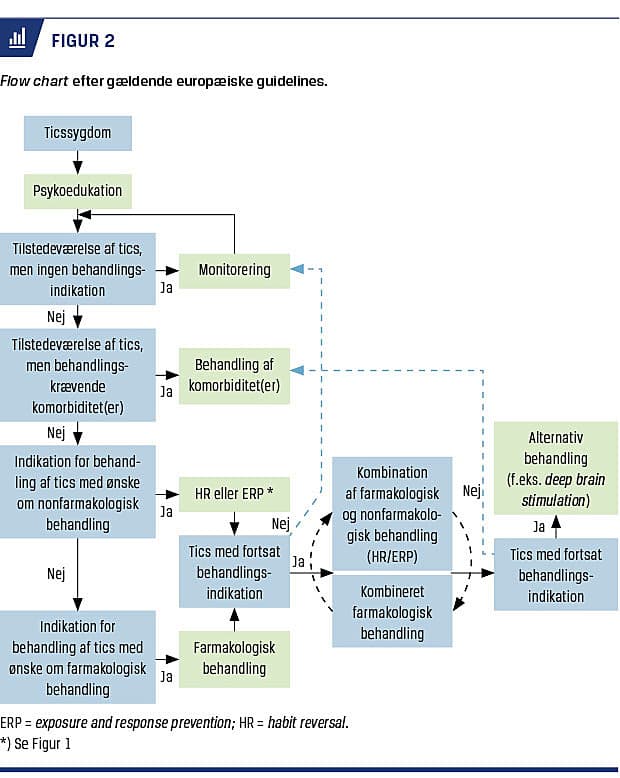 Patienterne udredes for TS og komorbiditeter efter gældende kliniske europæiske guidelines [26]. Hvis det mest generende symptom er komorbiditet, f.eks. OCD, autisme eller svær ADHD, bør den behandles først. Der henvises til udredning og evt. behandling i børne- og ungdomspsykiatrien. Hvis tics er det mest generende symptom, og de er behandlingskrævende (se tidligere), kan behandlingen vælges ud fra behandlingsalgoritmen, der er vist i Figur 2. HR og ERP kan begge være førstevalg. Anden behandling bør overvejes, hvis patienten f.eks. pga. ADHD har koncentrationsbesvær eller er for ung til at kunne mærke ticstrang, da disse forhold kan vanskeliggøre behandlingen.