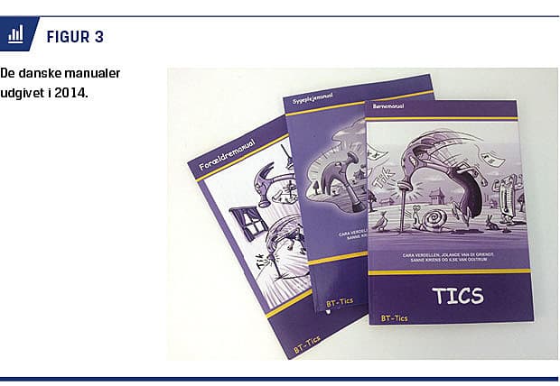 Ud over at en behandlingsmetode skal være virksom og effektiv, må den også være tilgængelig for den enkelte patient. Dette kan være en udfordring, da behandlingen skal faciliteres af hertil uddannet sundhedspersonale [28]. Flere forskellige løsninger har været søgt for at tilvejebringe større tilgængelighed. Der har været bred enighed om behovet for korrekt uddannelse af flere fagpersoner, der kan varetage træningen [28, 29]. Den nationale Touretteklinik for børn og unge på Herlev og Gentofte Hospital udbyder i dag en certificeret uddannelse, hvor man tager udgangspunkt i de evidensbaserede metoder. Hertil er der i december 2014 udgivet danske manualer, der skal benyttes ved behandlingen (Figur 3). Manualen er oversat fra de gældende europæiske manualer, der bygger på de evidensbaserede metoder HR og ERP. På Touretteklinikken har man siden 2013 brugt ticsundertrykkende behandling som en del af behandlingen af TS og CTD, og der tilbydes behandling til børn over otte år. Indtil videre har man på klinikken behandlet 90 børn og unge med ERP og HR, de præliminære resultater viser en effekt, der er sammenlignelig med den effekt, der er fundet i tidligere studier. Klinikken har et tæt samarbejde med børne- og ungdomspsykiatrien.