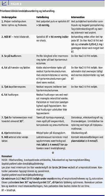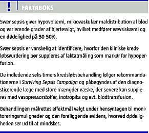 Kompleksiteten af det septiske syndrom kan gøre identifikationen særdeles vanskelig for læger, der ikke jævnligt har med disse patienter at gøre. Baseret på forfatternes kliniske erfaringer har vi listet en række basale kliniske observations- og behandlingsforslag, som kan hjælpe til tidligere diagnostik og håndtering af kredsløbssvigt ved svær sepsis (Figur 2 ). Arteriepunktur med laktatbestemmelse er i denne sammenhæng et særdeles vigtigt diagnostisk redskab.