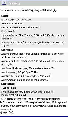 Sepsis er defineret som det systemiske inflammatoriske responssyndrom (SIRS) med påvist eller mistænkt infektiøs baggrund. SIRS betegner organismens reaktion på inflammation, som typisk er feber, takykardi, takypnø og leukocytose, men som også kan være hypotermi og leukopeni. Svær sepsis er sepsis kompliceret af organdysfunktion. Septisk shock er svær sepsis med hypoperfusion (plasma(p)-laktat ≥ 4 mmol/l) eller hypotension (systolisk blodtryk (BT) < 90 mmHg) trods adækvat væskebehandling (20-30 ml/kg bolus) og uden anden umiddelbar ætiologi til hypotension (Figur 1 ). Trods definitionerne er udviklingen af sygdommen en kontinuerlig proces, hvilket potentielt vanskeliggør identifikationen af disse patienter [2].