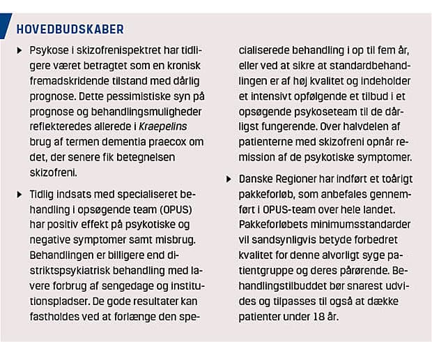 I OPUS-projektet (opsøgende behandling af unge med psykosesymptomer) inkluderedes 547 unge, der var over 18 år og havde debuterende psykose, i et randomiseret forsøg, hvor effekten af to års intensiv OPUS-behandling blev sammenlignet med standardbehandling. Efter to års behandling viste resultaterne, at OPUS havde en klart bedre effekt på både de psykotiske symptomer (hallucinationer og vrangforestillinger) samt de negative symptomer (initiativløshed og manglende engagement), og der var mindre misbrug, mindre frafald fra behandlingen, øget adhærens med medicinsk behandling, lavere sengedagsforbrug og øget patienttilfredshed [22, 23]. Også de pårørende til patienter i OPUS var markant bedre tilfredse med behandlingen end de pårørende til patienter i standardbehandling [24]. Næsten 40% af patienterne i OPUS havde komplet remission af de psykotiske og negative symptomer efter to år, mens dette kun gjaldt for en